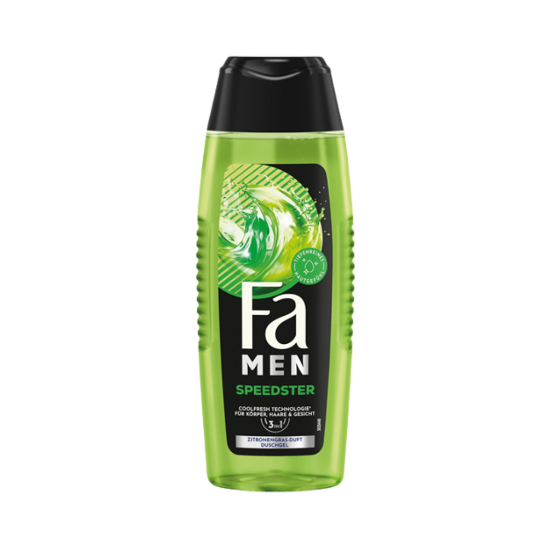 FA MEN Duschgel Speedster Belebt deinen Körper, Geist und Sinne. Mit mehr als 70 Jahren Erfahrung in der Körperpflege präsentiert FA MEN Speedster: Belebe deinen Körper, Geist und Sinne mit dem erfrischenden Duft von Zitronengras. Das 3in1 Duschbad mit Coolfresh Technologie¹ wäscht deinen Körper, dein Haar und Gesicht gründlich und hinterlässt ein tiefenreines Hautgefühl. Gut für dich & den Planeten: Das FA Duschgel mit 100 % recyceltem Flaschenkörper (exkl. Kappe und Label) und 94 % Inhaltsstoffen natürlichen Ursprungs (einschl. 89,8 % Wasser). Die Produktvorteile im Detail: Belebt Körper & Geist 3in1 Duschgel für Körper, Gesicht & Haar Mit erfrischendem Duft von Zitronengras Coolfresh Technologie¹ 94 % Inhaltsstoffe natürlichen Ursprungs² Vegane Formel³ 100 % recycelter Flaschenkörper4 Recycelbare Verpackung5 ¹ Fühlbare Frische dank Dufttechnologie² inkl. Wasser³ frei von Inhaltsstoffen tierischen Ursprungs4 ohne Label und Etikett5 exkl. Etikett, Recyclingfähigkeit abhängig von der lokalen Infrastruktur
