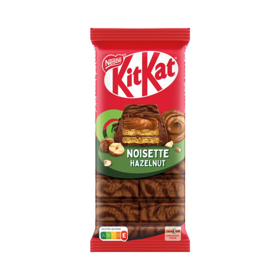 Die KitKat Tafel Noisette Hazelnut vereint knusprige Waffeln mit zartschmelzender Milchschokolade und einer cremigen Haselnussfüllung – ein Genussmoment für Schokoladenliebhaber. Die Tafel besteht aus 50,9 % Milchschokolade, 11,9 % Schokolade und 20,3 % Haselnusscreme. Die Kombination aus nussigem Aroma und der bekannten KitKat-Knusperwaffel sorgt für ein harmonisches Geschmackserlebnis mit extra Crunch.