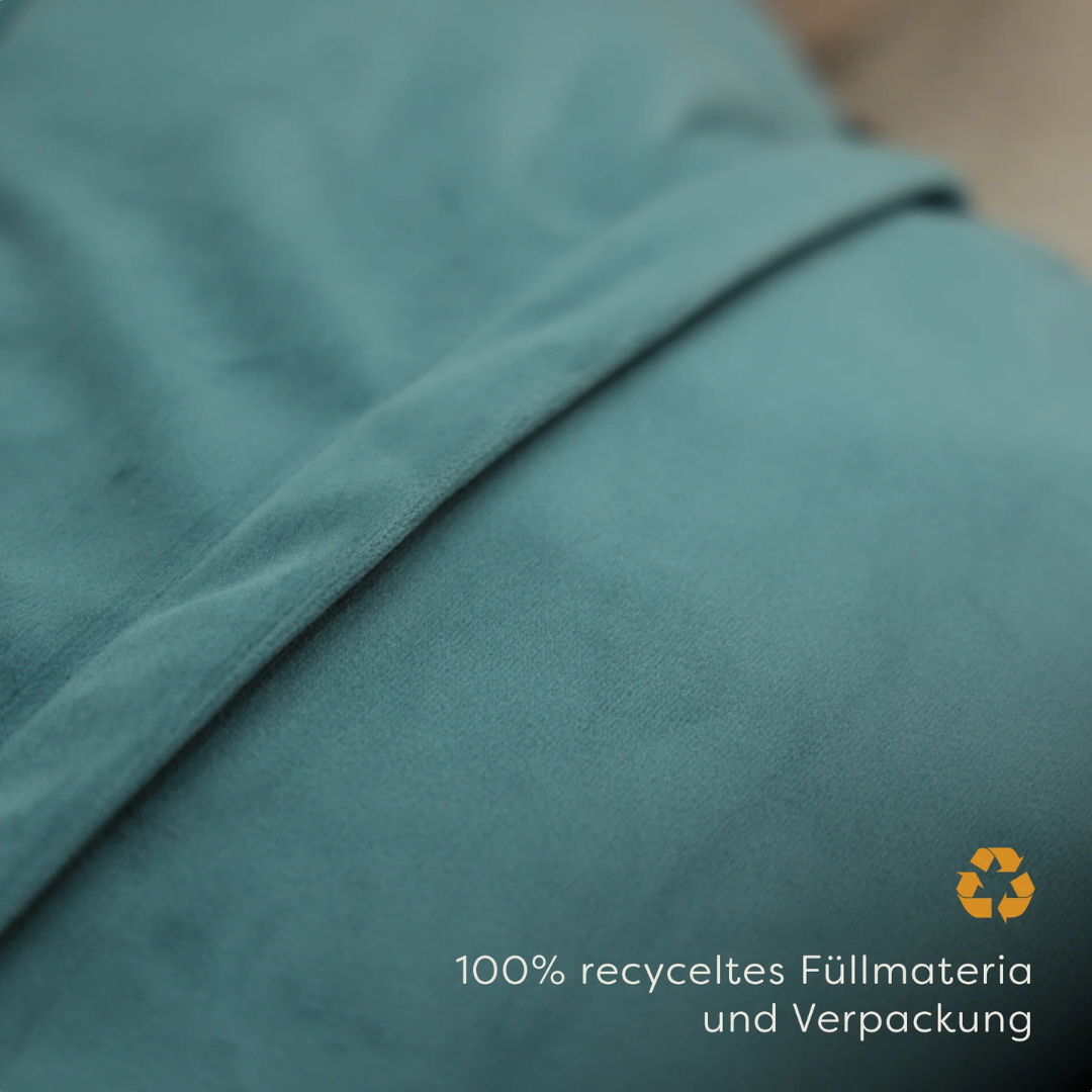 Der weiche Plush-Stoff hat eine luxuriöse Optik und ist in sechs verschiedenen Farben erhältlich. Bei Pleafs® sind wir überzeugt, dass Nachhaltigkeit und Komfort Hand in Hand gehen können. Deshalb ist das Kissen mit 100 % recycelten Materialien gefüllt und verpackt.