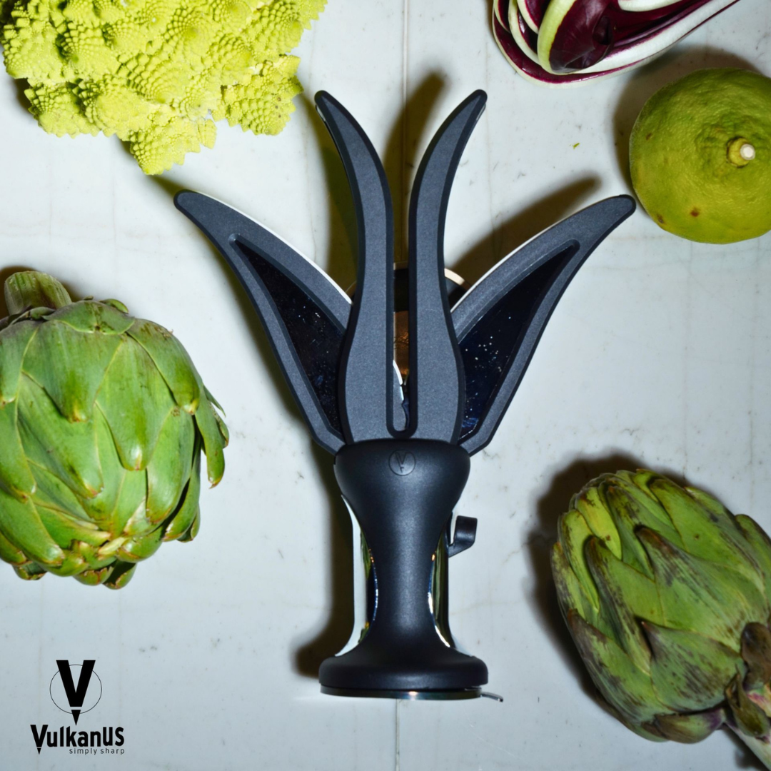 Der Vulkanus Crown ist nicht nur optisch ein Juwel. Ein Messerschärfer, welcher sogar japanische Messer schärfen kann. Seine intelligente Bauweise ermöglicht eine schnelle und flexible Befestigung sowohl vertikal an der Wand, als auch horizontal am Tisch. Der Crown ist geeignet für den Gebrauch im klassischen Haushalt, als auch in Großküchen und Fleischerei Betrieben, denn sein Messerschärfsystem schärft Klingenarten von glatter Schneide, über Wellenschliff bis zur Mikroverzahnung. Qualität Originalprodukte von Vulkanus haben eine sehr hohe Qualität in der Fertigung und Verarbeitung der Materialien. Dadurch erreichen alle Messerschärfer eine sehr hohe Lebensdauer. Dafür bürgt das Unternehmen VulkanUS. Achten Sie auf das Original. Flexibilität Ob am Tisch, an der Wand oder mobil in der Hand, der Vulkanus Crown hebt sich durch seine Flexibilität klar von anderen Messerschärfern ab. Problemloses Schärfen ohne jegliche Kratzer auf der Klingenoberfläche. Befestigung Der Vulkanus Crown kann mit seinem durchdachten Saugnapfsystem sowohl horizontal am Tisch, als auch vertikal an einer Wand stabil befestigt werden. Geeignete Oberfläche vorausgesetzt. Äußerst hochwertig und sehr robust Komplett aus hochwertigem und stabilem Kunststoff Schärfen und Abziehen in einem Gerät Macht glatte Klingen und Wellenschliff superscharf Schärft auch Klingen mit Mikroverzahnung Einfachste Bedienung für jeden Flexible Befestigung durch Saugnapfsystem Schärfwinkel: 11° – 21° Keine Kratzer auf der Klingenoberfläche Passt sich an den Schneidewinkel an Schärft ohne Wärmeeinwirkung Maße: Höhe 26 cm x 8 cm Spülmaschinenfest Trocknen mit Küchentuch Geeignet für Messer mit glatter Schneide Geeignet für Messer mit Wellenschliff